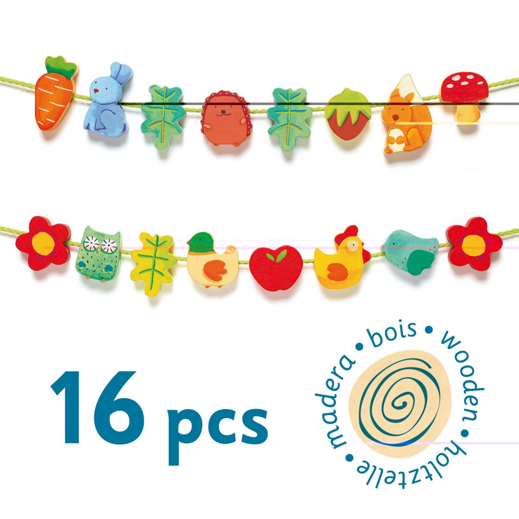 Forme de insirat - margele din lemn de forme si culori diferite cu tematica naturii: animale, frunze, fructe si legume. Copiii se distreaza infiletand margelele pe cele doua sireturi si lasandu-si imaginatia sa zburde. Ei invata despre animale si habitatele lor naturale in timp ce isi dezvolta abilitatile motorii fine si coordonarea ochi-mana Jocul contine 16 piese din lemn, pe care copilul le poate insira pentru a obtine o decoratie minunata. Varsta recomandata: + 2 ani. Confectionat din lemn cu vopsele non-toxice, conform reglementarilor EN71 ASTM. Avertisment: contine snur, contraindicat copiilor mai mici de 2 ani. A se utiliza sub atenta supraveghere a unui adult.