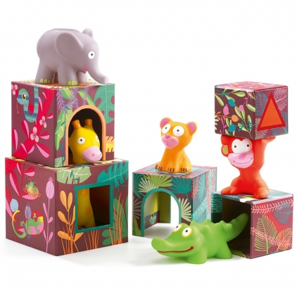 O varianta adaptata a turnului babel, in care fiecare cub devine casuta unui animal si fiecare animal poate la randul sau ca sa sustina cuburile. Setul contine: 5 cuburi cartonate mari, ilustrate diferit pe fiecare parte 5 animale din silicon non alergic, care pot fi folosite si ca jucarii gingivale. Joaca fara sfarsit: copiii pot stivui blocurile de carton pentru a face un turn sau le pot potrivi unul in altul. De asemenea, le pot raspandi si crea o multime de scene sau pur si simplu se pot juca doar cu animalele. O multime de povesti de inventat. Blocuri de carton groase si rezistente. 3 blocuri cu deschideri astfel incat animalele sa poata fi plasate in interior. Copiii invata despre numerele, formele si animalele ilustrate pe blocuri. Animalele foarte mari ies din blocuri. Continut: 5 blocuri de carton si 5 animale din jungla din plastic moale (girafa, crocodil, elefant, maimuta si pui de leu). Varsta recomandata: +18 luni. Confectionat din materiale non-toxice, cu vopsele non-toxice, conform reglementarilor EN71ASTM. AVERTISMENT: Contraindicat copiilor sub 18 luni. A se utiliza sub directa supraveghere a unui adult.