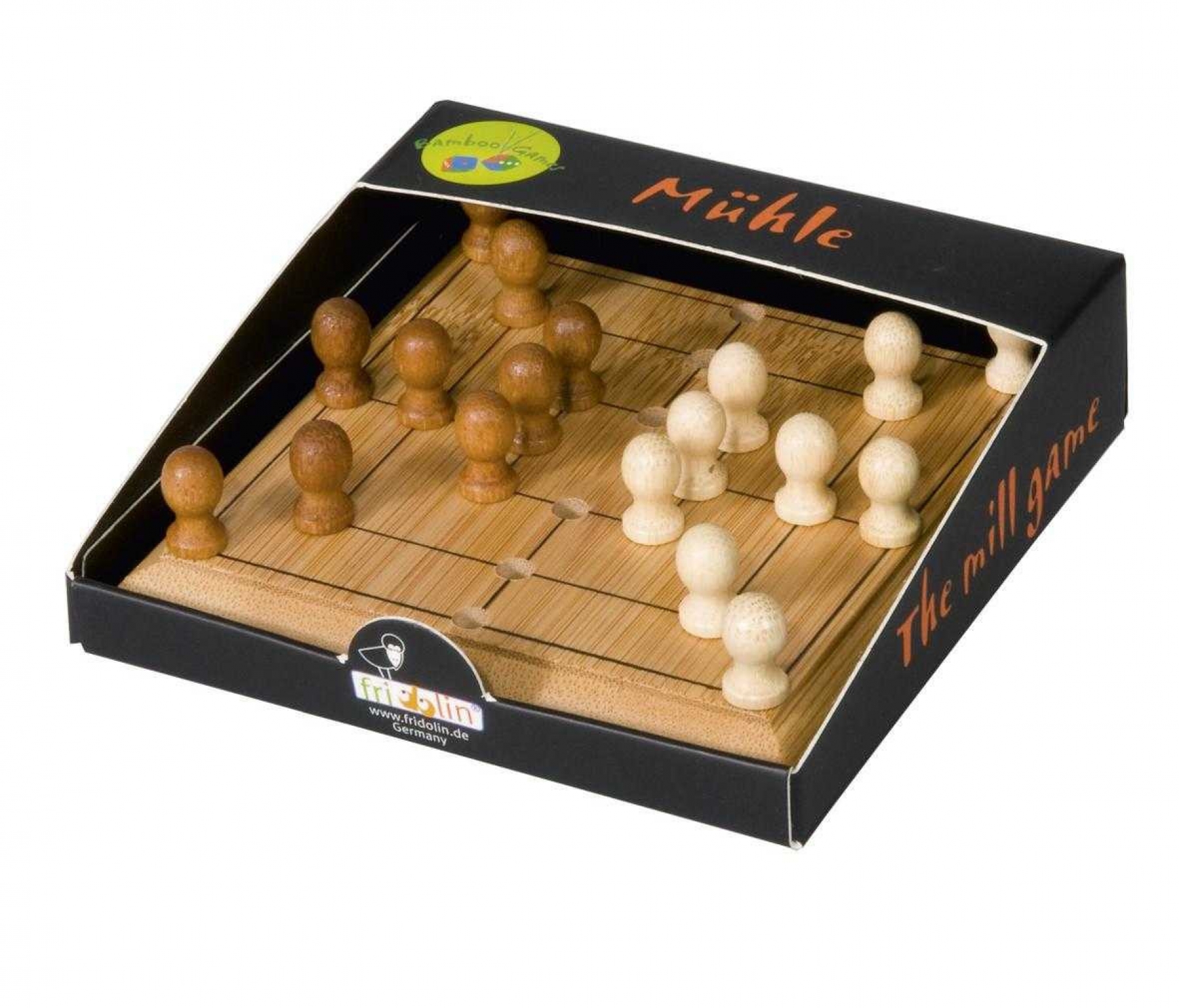 Un clasic pentru toata familia! Reguli de joc: la incepulul partidei tabla de joc este goala. Jocul se desfasoara in doua etape In prima etapa jucatorii pun rand pe rand cate una toate piesele proprii pe punctele de pe tabla de joc In cea de-a doua etapa jucatorii muta rand pe rand piesele proprii cu scopul sa realizeze cat mai multe mori Cand un jucator realizeaza o moara, are dreptul sa elimine o piesa a adversarului Mutarea unei piese se face numai de-a lungul uneia dintre liniile trasate pe tabla de joc si doar intr-un punct invecinat Cand un jucator realizeaza un sir de trei piese proprii de-a lungul uneia dintre liniile tablei a realizat o moara Piesa aleasa pentru eliminare trebuie sa nu faca parte dintr-o moara Daca un jucator inchide doua mori simultan , poate elimina doua piese ale adversarului Castiga jucatorul care a eliminat cele mai multe piese ale adversarului Varsta recomadata: + 6 ani Confectionat din lemn si materiale non-toxice, cu vopsele non-toxice conform reglementarilor EN71ASTM Contraindicat copiilor mai mici de 3 ani Contine piese mici Pericol de sufocare A se utiliza sub directa supraveghere a unei persoane adulte Producator: Fridolin, Germania