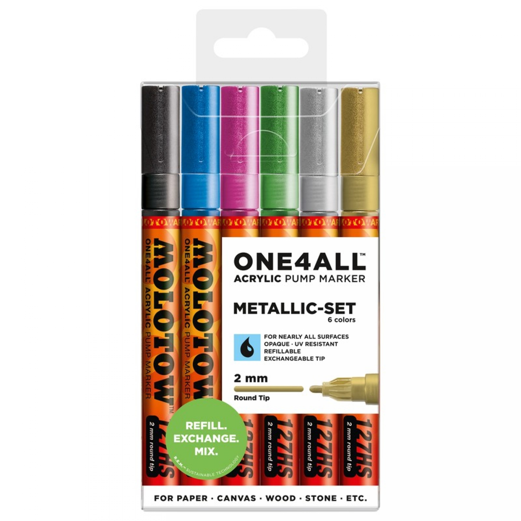 Acest set conține 6 markere ONE4ALL™ 127HS, cu nuanțe metalice, fiind oferit într-o carcasă transparentă, în care vei găsi și informații tipărite despre produse.- Set format din 6 markere în culori metalice, livrate în carcasă transparentă