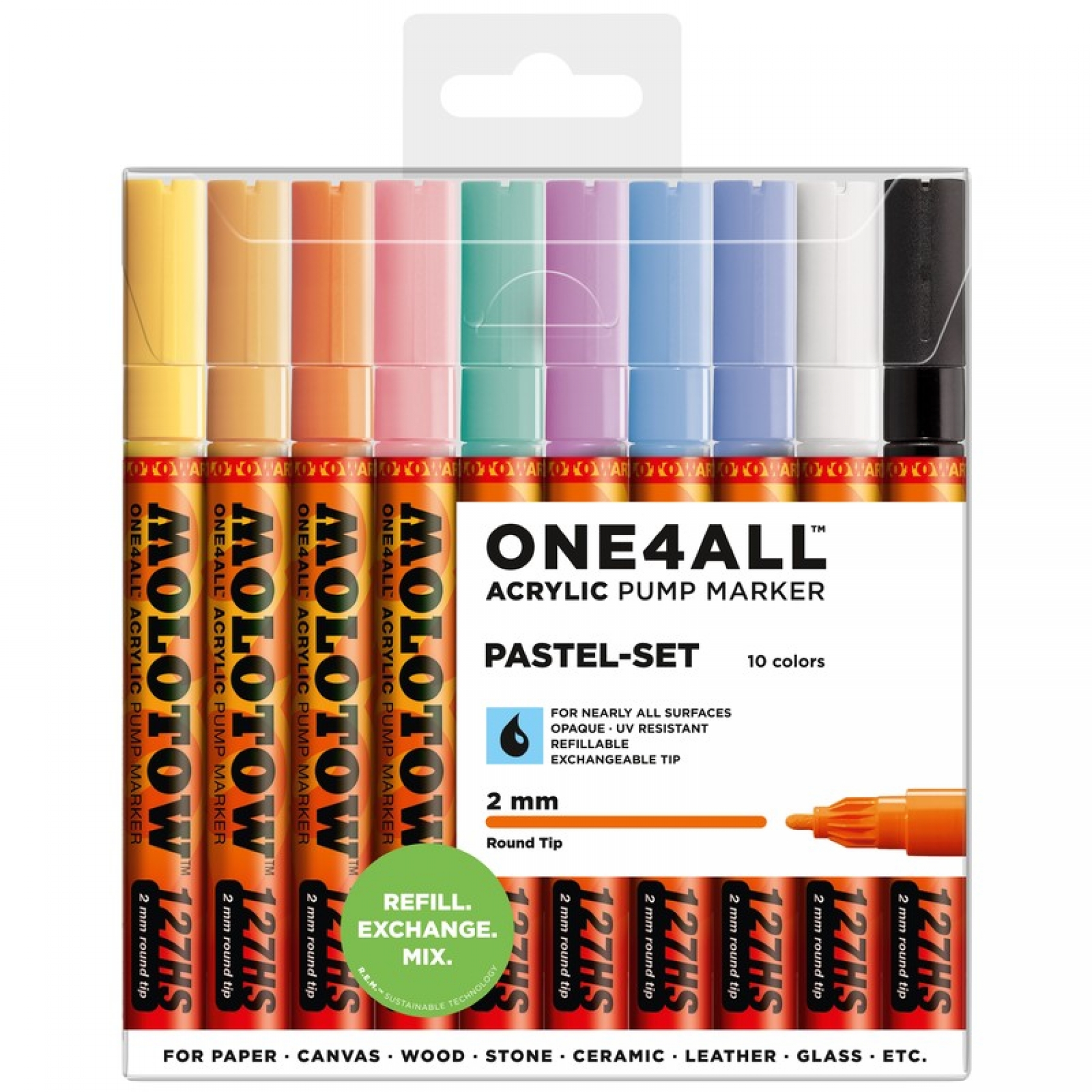 Setul include 10 x ONE4ALL™ 627HS (culori pastel) și este oferit într-o carcasă transparentă, în care vei găsi și informații tipărite despre produse.- Setul 10 x ONE4ALL™ 127HS conține markere acrilice dotate cu vârf rotund, de 2 mm. Culori: