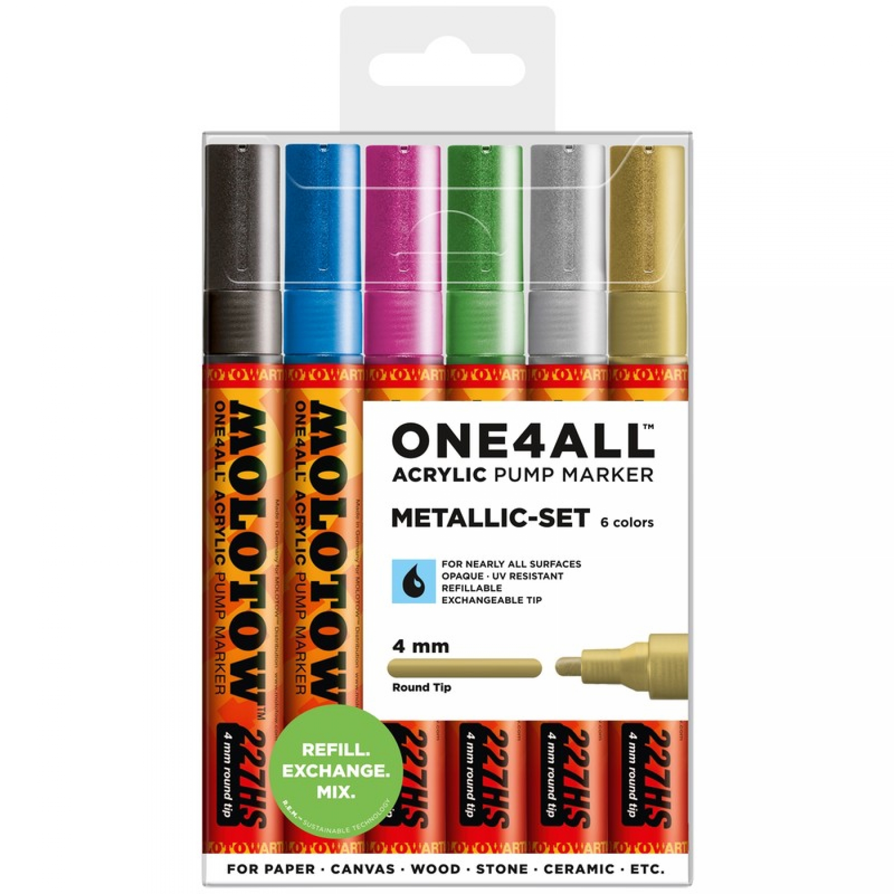 Setul include 6 x ONE4ALL 227HS în nuanțe metalice și este livrat într-un pachet transparent cu informațiile despre produse aplicate pe părțile față-spate și interior.- 6 x ONE4ALL 227HS, markere acrilice cu vârf Round-Tip de 4 mm