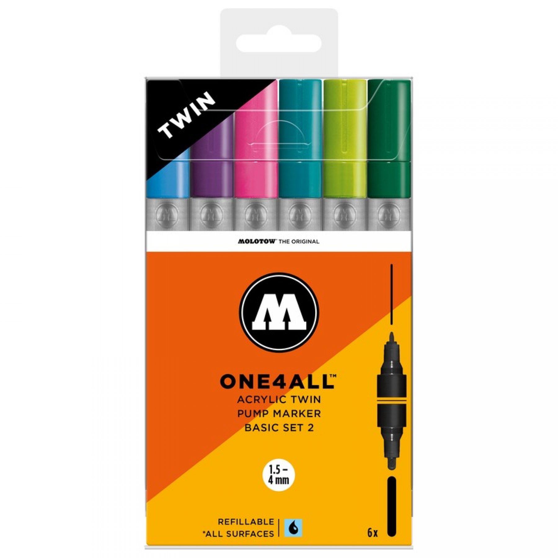 Include 6 x Acrylic Twin Pumpmarkers deja echipate cu extensii de reîncărcare și este livrat într-un pachet transparent cu informațiile despre produse aplicate pe părțile față-spate și interior.- 6 x marker ACRYLIC TWIN cu vârf Crossover de 1.5 mm și Round Tip de 4 mm.