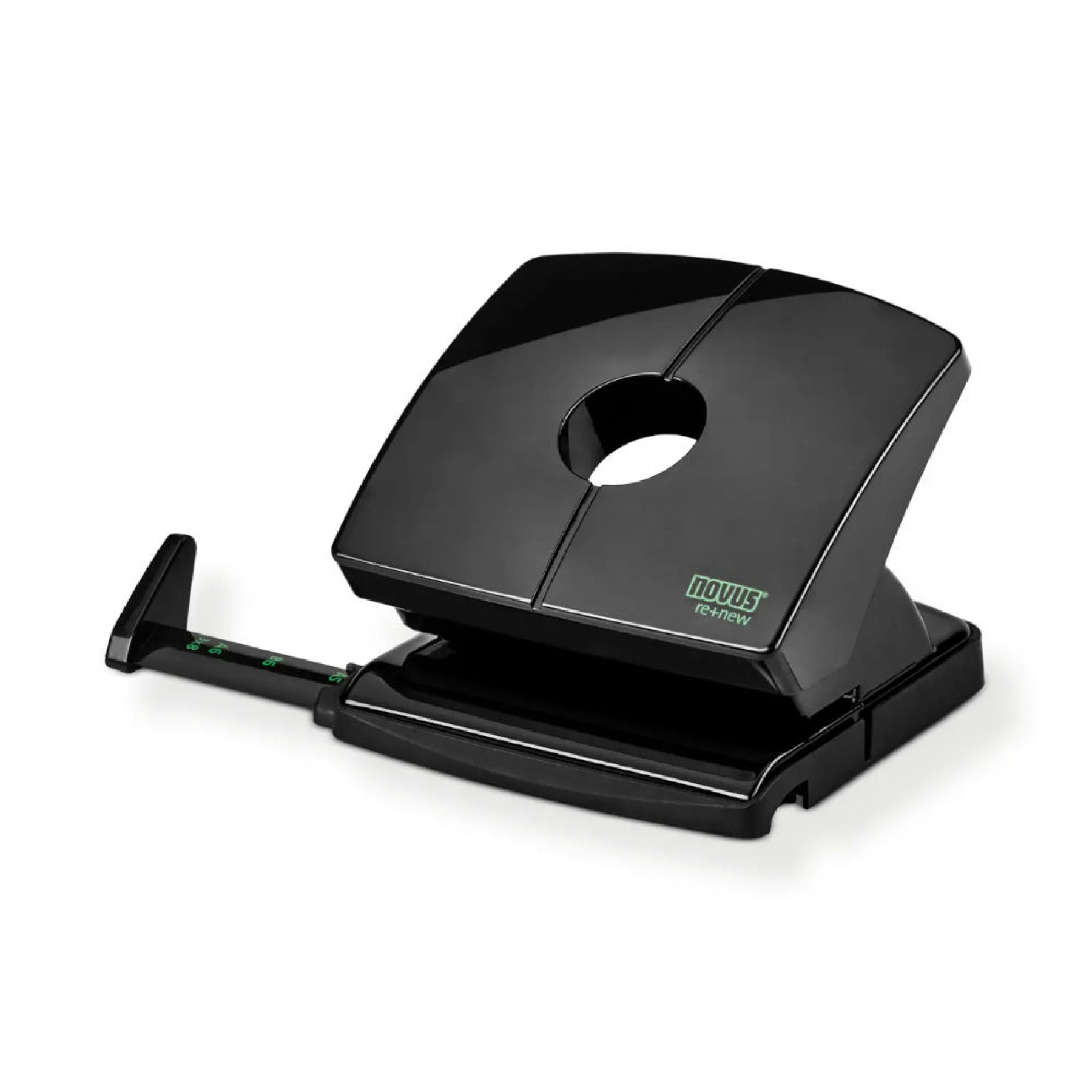 Perforator sustenabil pentru utilizare profesionala la birou, cu 64% continut plastic reciclat in componenta carcasei. Corp solid din metal si carcasa din plastic negru. Prevazut cu rigla de ghidaj din plastic.