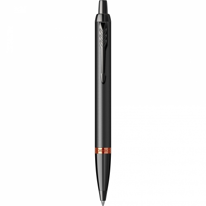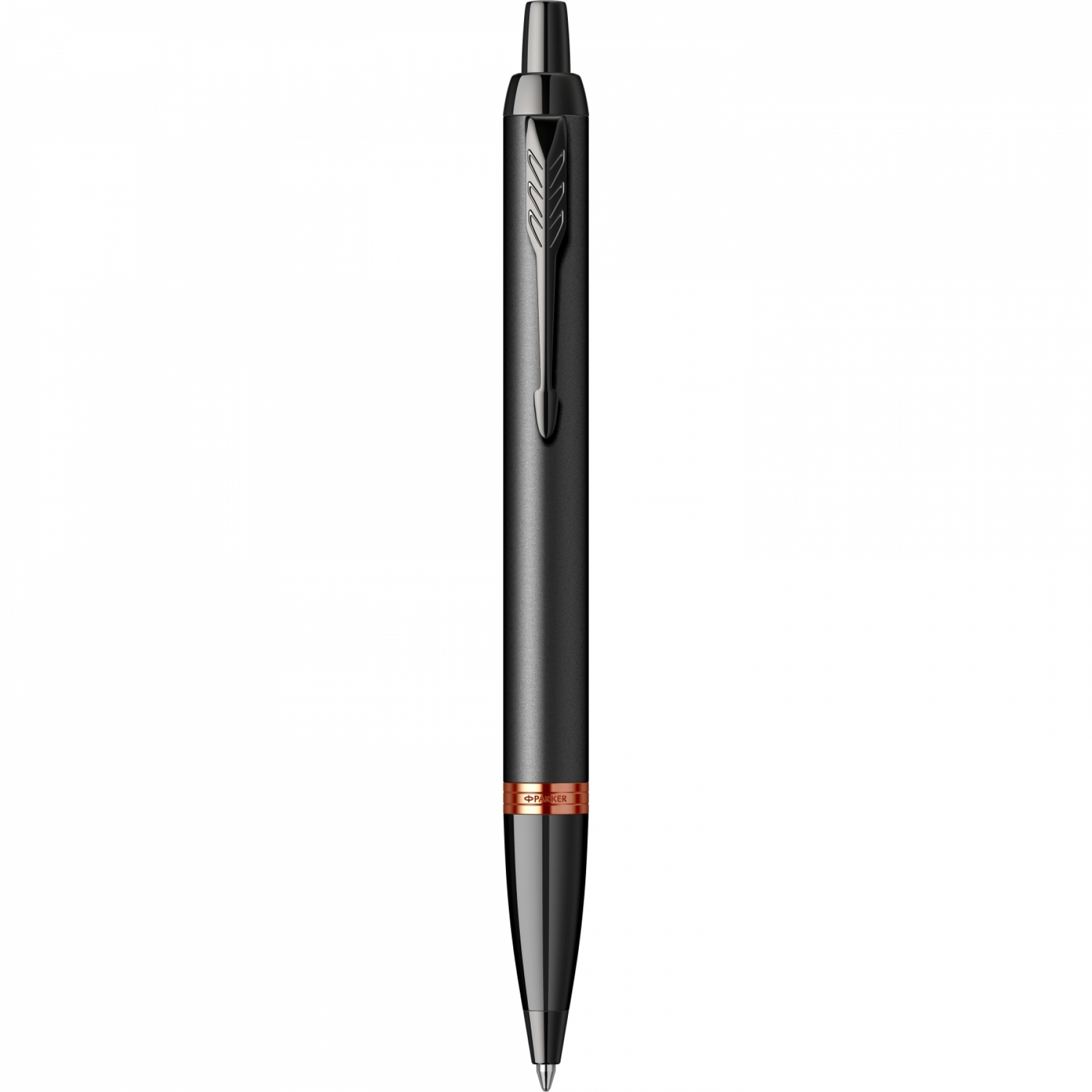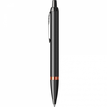 : Accesorii din alama placate cu aliaj black trim si inele placate prin tehnologie PVD cu aliaj orange metal. Clip din otel placat cu aliaj black trim. Corp: Corp din alama lacuit cu multiple straturi de lac negru mat. Grip: Grip din ABS Mecanism: Mecanism click (prin apasare) Mina: Mina pix Parker (vezi consumabile)