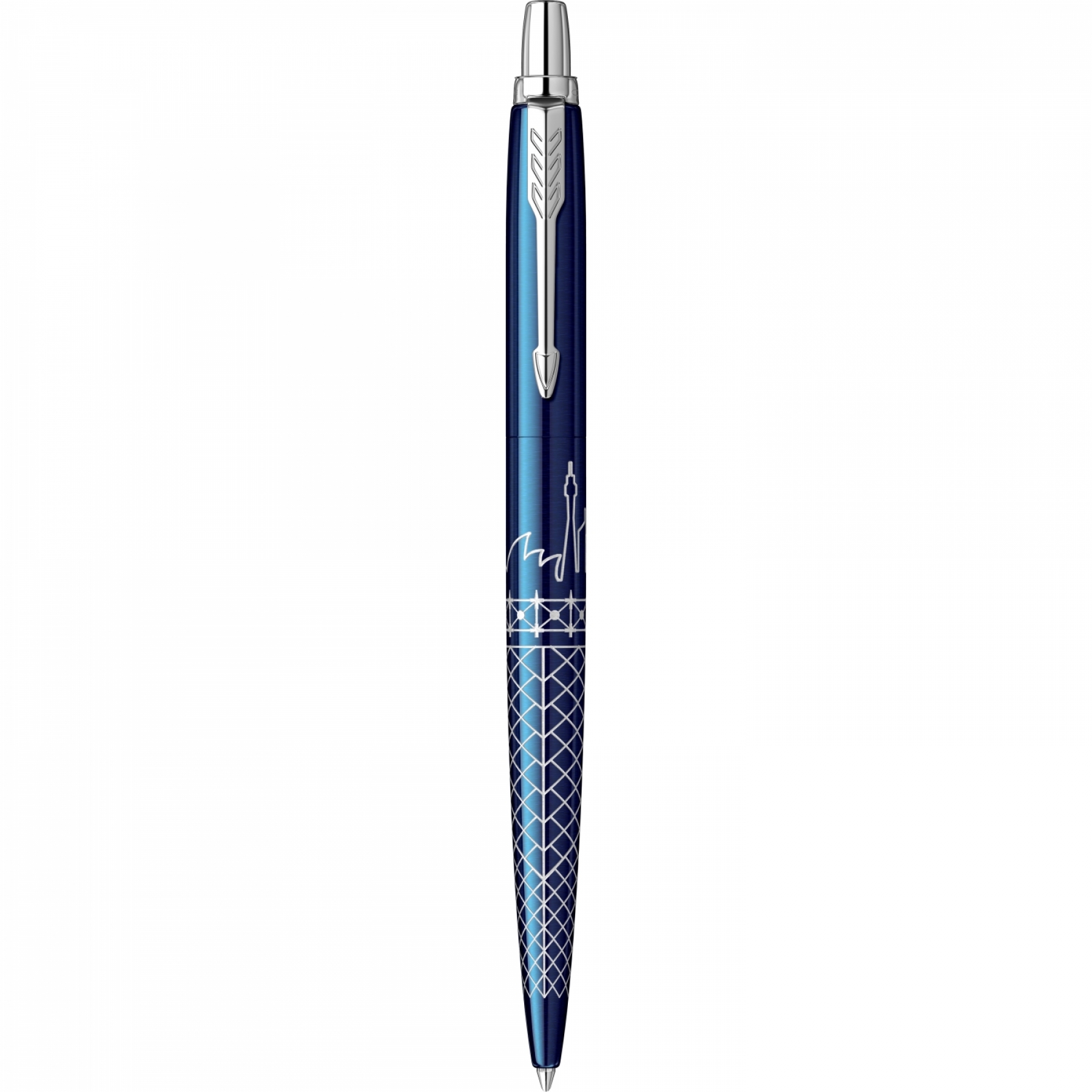 Accesorii: Accesorii din otel inoxidabil placate cu crom. Clip din otel inoxidabil placat cu crom Corp: Corp inferior din otel inoxidabil lacuit cu multiple staturi de lac albastru si cizelat cu model gravat. Corp: Corp superior din otel inoxidabil lacuit cu multiple straturi de lac albastru. Mecanism: Mecanism click (prin apasare) Mina: Mina pix Parker (vezi consumabile)