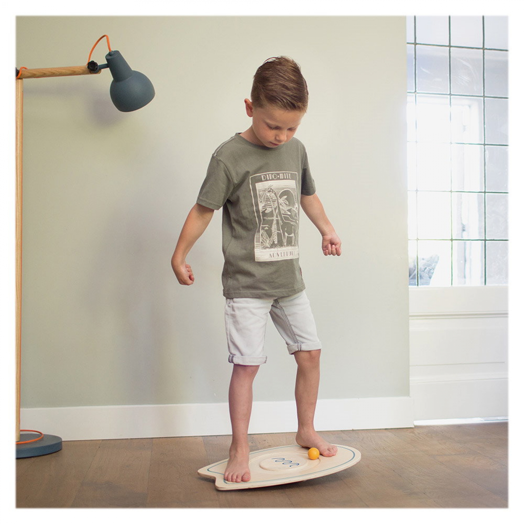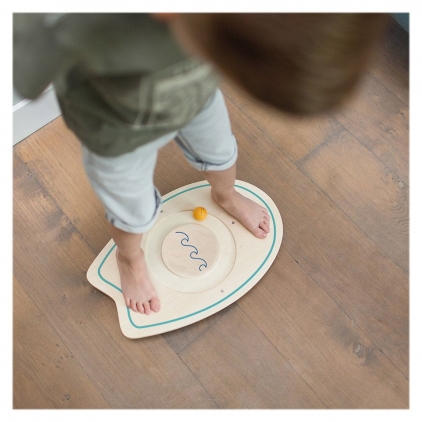 Aceasta placa de surf pentru echilibru constituie o provocare super distractiva pentru cei mici si ii ajuta sa isi dezvolte echilibrul, in timp ce isi controleaza corpul pentru a misca placa si a rostogoli bilele de-a lungul traseului. Placa de surf pentru echilibru de la BS Toys consta intr-o placa de balansare din lemn ovala, prevazuta in partea superioara cu o pista rotunda in care ruleaza bilele colorate din lemn, imprimate cu pestisori si rechini. Scopul este de a face bilele sa circule in jurul pistei, fara a iesi in afara, prin balansarea placii. Stand pe placa, copiii trebuie sa isi foloseasca echilibrul si sa isi controleze muschii de baza ai corpului pentru a rostogoli mingile prin santul circular, fara a le lasa sa cada. Setul contine: 1 placa de echilibru, 2 bile mari si 3 bile mici. Placa si bilele sunt realizate din placaj si lemn masiv vopsit cu vopsele sigure, netoxice, pe baza de apa. Placa de echilibru este o jucarie motrica pentru copii, ce incurajeaza miscarea fizica si ajuta la dezvoltarea motricitatii grosiere si abilitatilor de echilibrare. Cu ajutorul ei, copiii isi vor exersa puterea de concentrare pentru a gasi balansul perfect, proces in care se va realiza si intarirea musculaturii. Greutatea maxima admisa: 60 kg Dimensiune placa: 46 x 30 x 3 cm Diametru minge mare: 3.5 cm; diametru minge mica: 2 cm Varsta recomandata: 4 ani+