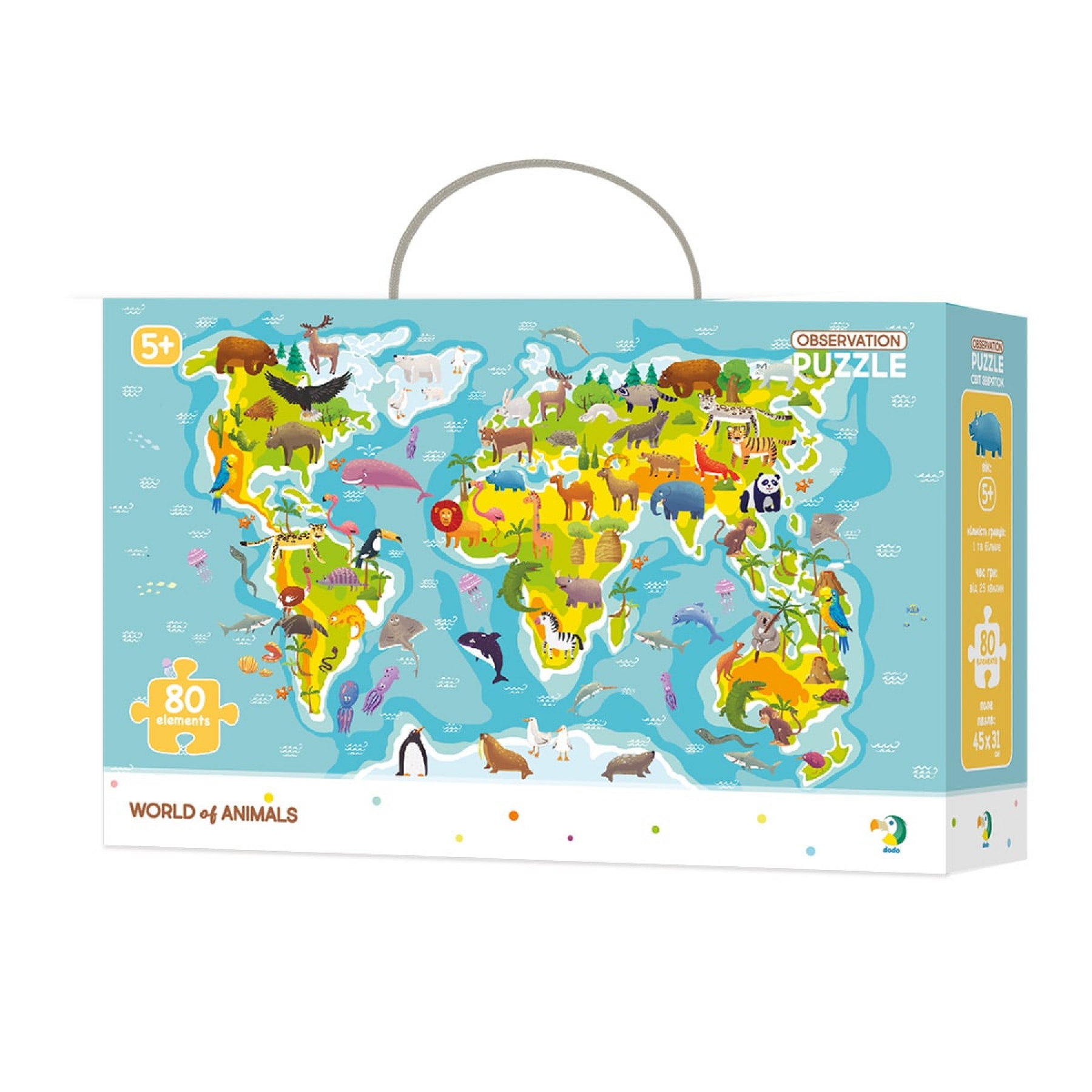 Asambleaza corect cele 80 de piese ale acestui puzzle viu colorat de la Dodo si porneste intr-o calatorie in jurul lumii in care vei descoperi o multime de animale de pe tot globul si mediile lor de viata! Descopera piesa cu piesa un nou continent si o multime de animale simpatice care il populeaza si traverseaza apoi intinsele oceane ale lumii, pentru a dezvalui vietatile ascunse in adancuri! In plus, dupa ce ai terminat de asamblat corect intreaga imagine, incearca sa identifici pe harta lumii animalele de pe chenarul puzzle-ului. Puzzle-ul de observare , žAnimalele lumii, Dodo este un puzzle educational captivant si un cadou perfect pentru copiii cu varsta de 5 ani si peste. Setul contine 80 de piese confectionate din carton rezistent, de calitate, in culori vibrante, care vor dezvalui o imagine bogat detaliata si colorata a diverselor animale care populeaza globul pamantesc. Acest puzzle contribuie la dezvoltarea: indemanarii, imaginatiei, gandirii logice, perceptiei vizuale, atentiei, observatiei, concentrarii, motricitatii fine, coordonarii ochi-mana, abilitatilor de asociere si a dexteritatii. In plus, cu ajutorul acestui puzzle, copiii invata despre animalele din intreaga lume si inventeaza povesti distractive si isi imbunatatesc cunostintele primare despre geografia lumii. Dodo Toys ofera o colectie minunata de puzzle-uri si jocuri pentru copiii de la 18 luni in sus. Cu modele frumoase si distractive, aceste puzzle-uri cuprind de la puzzle-uri simple de 2 piese pentru cei mici, pana la puzzle-uri mai provocatoare de 1000 de piese, pentru copiii mai mari. Gama de jocuri si puzzle-uri vibrante si colorate Dodo ofera beneficii educationale si de dezvoltare, fiind cadourile perfecte pentru a ajuta copiii sa invete in timp ce se distreaza. Dimensiunea puzzle-ului: aprox. 41 x 31 cm Varsta recomandata: 5-10 ani Atentie!Contraindicat copiilor mai mici de 3 ani.Jucaria produsul poate contine piese mici care se pot inghiti sau inhala existand pericolul de accidente.