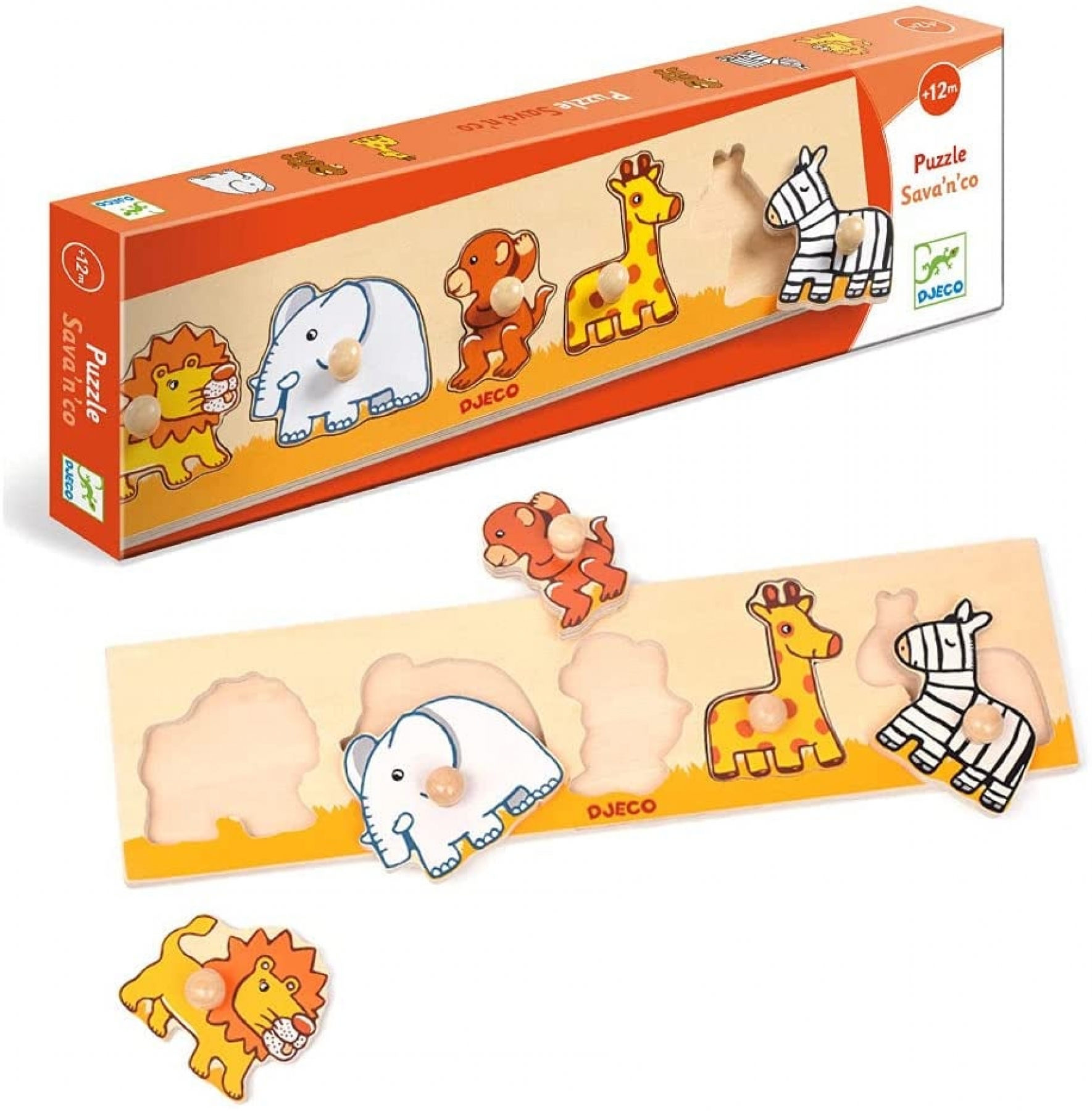 Puzzle cu buton, animalute din Savana Aceasta jucarie este un puzzle cu piese cu maner din lemn, special conceput pentru copii cu varsta peste 6 luni pentru a exersa prinderea cu 3 degete, ce ii va ajuta sa manance bucati de alimente. Pentru dezvoltarea limbajului, in timpul jocului, parintii pot oferi informatii despre fiecare animal: unde traieste, ce sunete scoate, ce mananca, informatii despre modul de viata si de hranire. Puzzle-ul din lemn cu maner ajuta la dezvoltarea abilitatilor motrice, dar si vizuale. Acest puzzle reprezinta o jucarie de cautare a formelor, deoarece fiecare animalut reprezentat in imagine are o anumita forma si se potriveste intr-o singura forma decupata din tabla. Puzzle din lemn cu maner are rolul de a imbunatati coordonarea ochi mana, fiind nevoie de un timing perfect intre ochi si mana pentru a nimeri formele incastru. Aceasta punctualitate ochi mana este un element important in hranirea autonoma a copilului. Puzzle-ul din lemn cu maner este o jucarie educativa, fiind des folosita la crese tocmai pentru imbunatatirea abilitatilor motrice si coordonarii ochi mana. Varsta recomandata: + 1 an. Dimensiune produs : 29.8 x 7.8 x 1 cm. Producator: Djeco, Franta Puzzle cu 5 piese, din lemn cu buton. Ambalat in cutie de carton. Confectionat din lemn si materiale non-toxice, cu vopsele non-toxice, conform reglementarilor EN71ASTM. Avertismente! Jucaria produsul poate contine piese mici care se pot inghiti sau inhala existand pericolul de sufocare sau nu este potrivita copiilor mai mici de 1 an Nu lasati ambalajele jucariilor produselor la indemana copiilor. Indepartati orice ambalaj al jucariei produsului inainte de a da jucaria produsul copilului. Va rugam sa supravegheati copilul in timp ce se joaca foloseste acest produs. Pastrati instructiunile si etichetele pentru referinte viitoare. Pastrati jucaria produsul departe de foc, feriti jucaria produsul de temperaturi ridicate si umiditate. Produsul este nou si comercializat in ambalajul original al producatorului. Imaginile au caracter informativ.Nuanta, tonul si intensitatea culorii pot varia in functie de monitor.