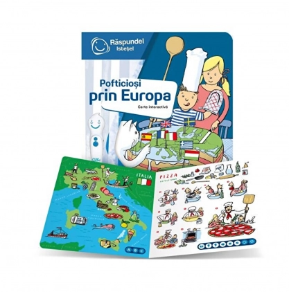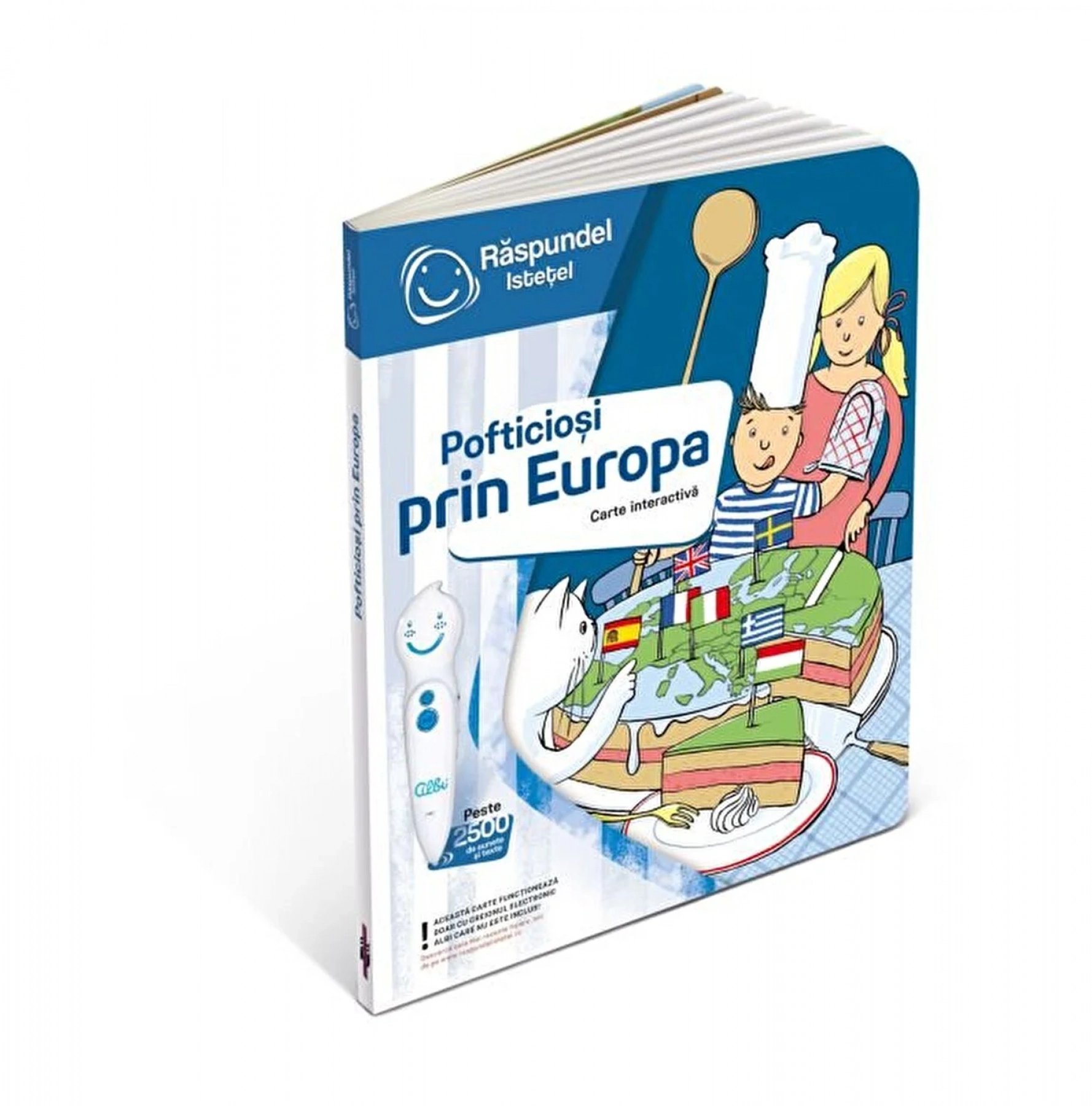 Cartea interactiva Pofticiosi prin Europa face parte din colectia Raspundel Istetel si este destinata copiilor de la 6 la 12 ani, care vor descoperi lucruri interesante despre bucatariile celor mai renumite tari europene si vor invata despre preparate tipice locale. Cartea este plina de ilustratii colorate, dialoguri interesante si chestionare pentru ca cei mici sa isi poata testa cunostintele. Fratilor Laura si Mihai le place sa calatoreasca. Prin urmare, au pornit intr-o calatorie prin diverse tari europene, in care au fost invitati de catre prietenii lor bucatari. Descoperiti informatii interesante despre felurile de mancare specifice Spaniei si Suediei, cele mai iubite preparate din Italia, Marea Britanie, Grecia, Ungaria sau Spania. In plus, puteti gati si voi impreuna cu cei doi frati si prietenii lor bucatari cele mai populare retete din diverse tari. Aceasta cartea plina de retete, anecdote amuzante si calatorii a fost pregatita pentru voi de catre Kuba si Blanka un cuplu de parinti experimentati si bloggeri culinari, populari in Cehia. Continut: Peste 2.500 de sunete si texte. Aceasta carte functioneaza doar impreuna cu creionul Albi, pe care il puteti achizitiona separat sau il gasiti in pachetele cu creion si carte. Un creion functioneaza cu toate produsele Raspundel Istetel. Varsta recomandata: 6+ ani. Atentie! Contraindicat copiilor mai mici de 3 ani. Jucaria produsul poate contine piese mici care se pot inghiti sau inhala, existand pericolul de sufocare. Nu lasati ambalajele jucariilor produselor la indemana copiilor. Indepartati orice ambalaj al jucariei produsului inainte de a da jucaria produsul copilului. Va rugam sa supravegheati copilul in timp ce se joaca foloseste acest produs. Pastrati instructiunile si etichetele pentru referinte viitoare. Pastrati jucaria produsul departe de foc, feriti jucaria produsul de temperaturi ridicate si umiditate.