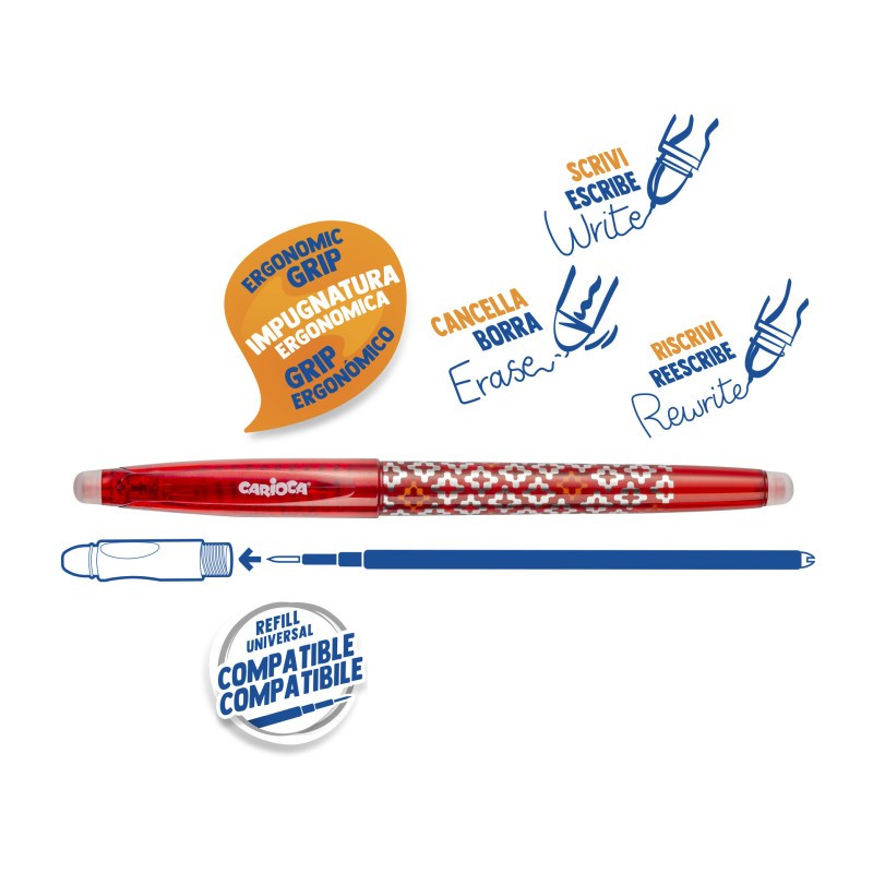 Roller cu cerneala termosensibila: scrie — sterge — rescrie. Este potrivit pentru scoala si birou, dar nu este recomandat pentru redactarea si semnarea documentelor legale intrucat cerneala termo-sensibila se sterge prin frictiune sau la temperaturi mai mari.