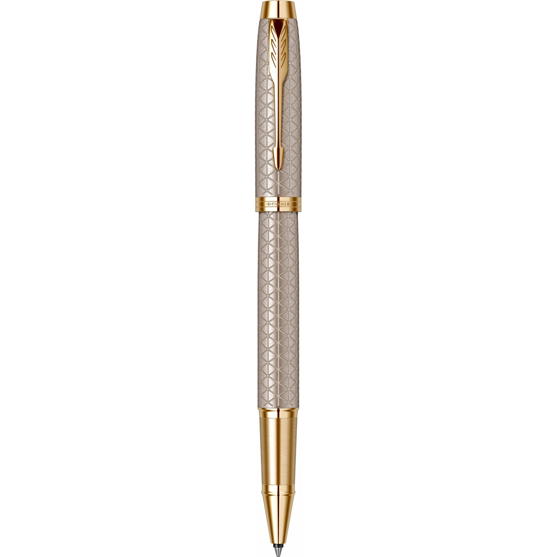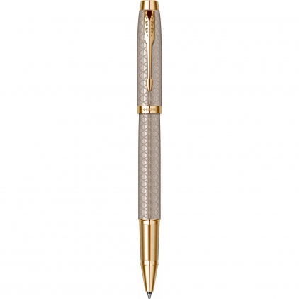 Accesorii: Accesorii din alama placate cu aur de 23K. Clip din otel inoxidabil placat cu aur de 23K Capac: Capac din aluminiu polisat gravat laser cu model triunghiular, lacuit cu multiple straturi de lac argintiu lucios. Capacul se inchide prin apasare Corp: Corp din aluminiu polisat gravat laser cu model triunghiular, lacuit cu multiple straturi de lac argintiu lucios Grip: Grip din alama cizelat cu model brushed, placat cu aur de 23K Mina: Mina roller Parker (vezi consumabile).