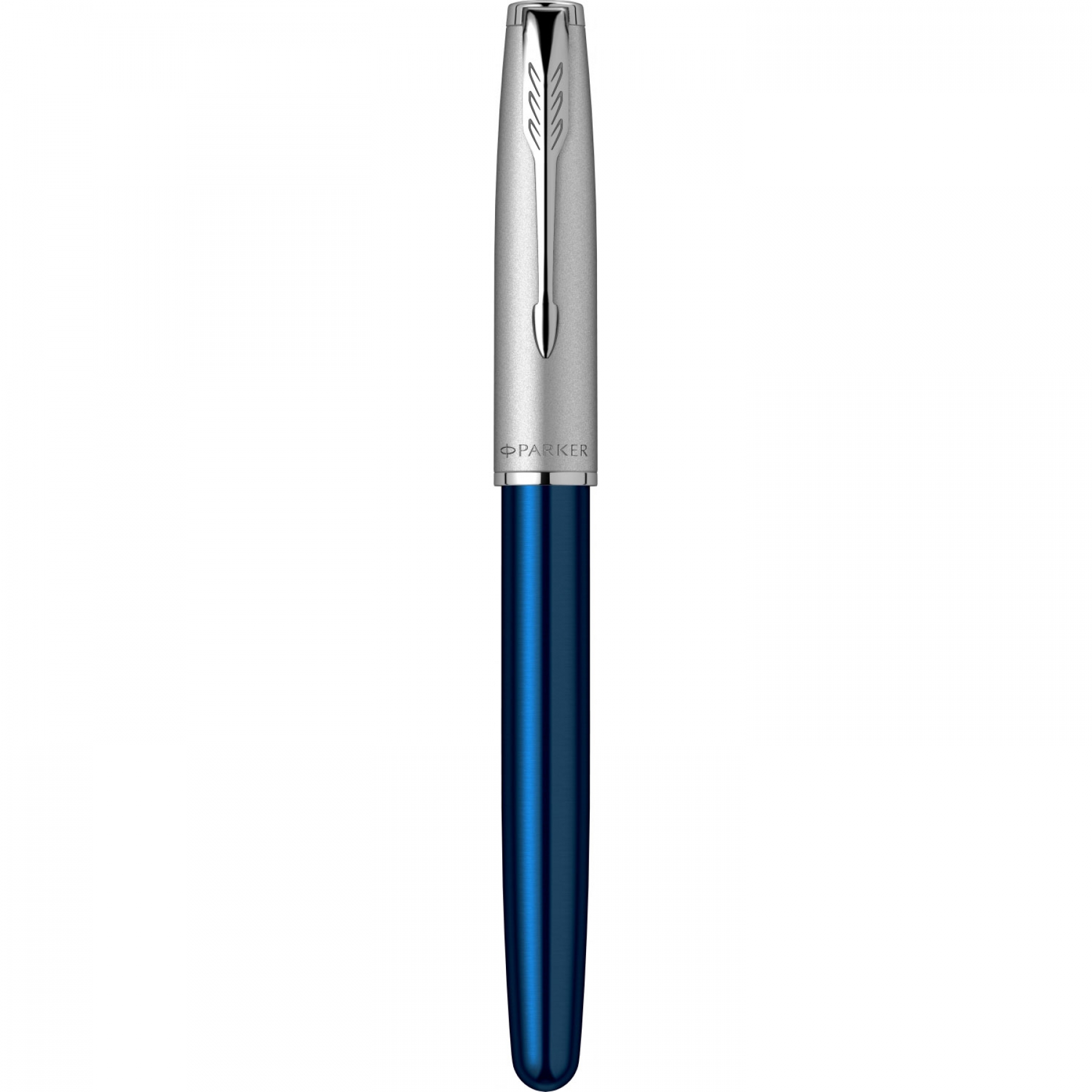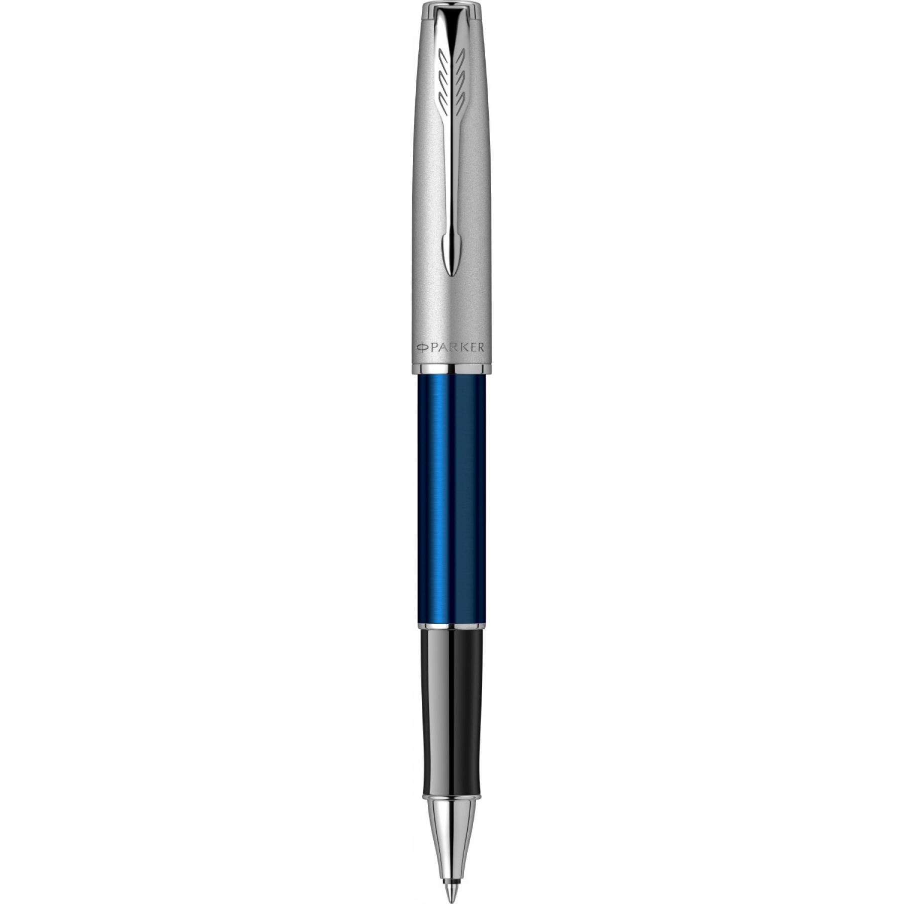 Accesorii: Accesorii din otel inoxidabil cromate. Clip din otel inoxidabil cromat. Corp: Corp din otel inoxidabil lacuit cu multiple straturi de lac albastru satinat. Capac: Capac din otel inoxidabil satinat. Grip: Grip din rasina acrilica de culoare neagra. Mina: Mina roller Parker (vezi consumabile)