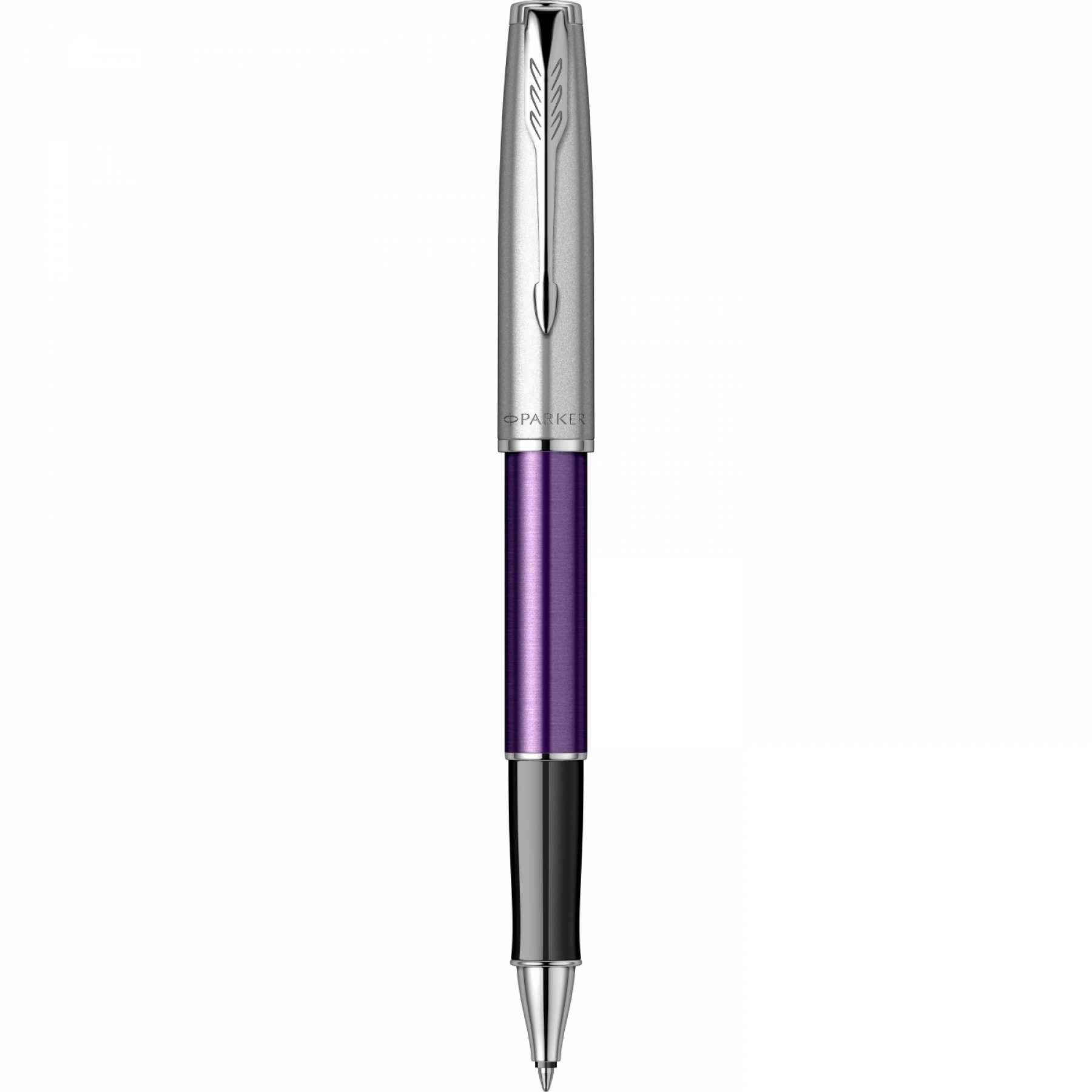 Accesorii: Accesorii din otel inoxidabil cromate. Clip din otel inoxidabil cromat. Corp: Corp din otel inoxidabil lacuit cu multiple straturi de lac violet satinat. Capac din otel inoxidabil satinat. Grip: Grip din rasina acrilica de culoare neagra. Mina: Mina roller Parker (vezi consumabile)