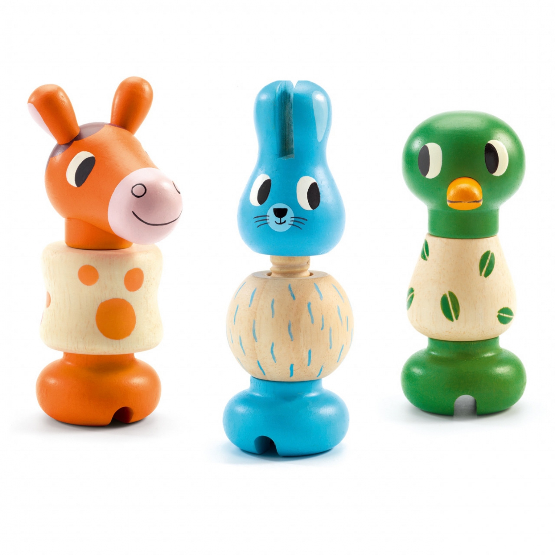 Insurubeaza si asambleaza cele 3 animalute simpatice! Prin acest joc, copilul invata marimile, culorile, cum sa construiasca si isi dezvolta abilitati motorice fine, cognitive, coordonarea ochi-mana si jocul independent. Jocul contine 3 animalute de culori diferite, fiecare compusa din 3 piese. Piesele se imbina prin infiletare. Inaltimea unui animalut este de 10,6 cm. Confectionat din lemn, cu vopsele non-toxice, conform reglementarilor EN71ASTM. Varsta recomandata: +18 luni. AVERTISMENT: Contraindicat copiilor mai mici de 18 luni, contine piese mici. A se folosi sub directa supraveghere a unei persoane adulte.