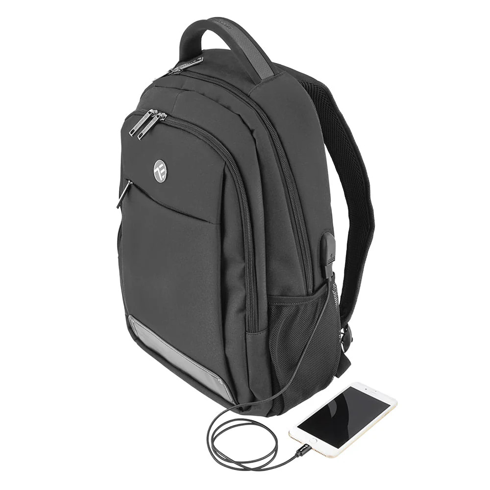 Este perfect pentru laptopuri de pana la 15,6" datorita compartimentului principal captusit pentru protectie laptop. De asemenea, va avea grija de bateria dispozitivelor tale cu portul USB integrat. Dispune si de husa impotriva prafului si ploii.