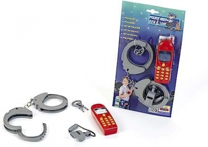 Jucarie, accesorii de politist. Contine 3 accesorii de politist: o pereche de catuse din plastic +chei un fluier din plastic un telefon mobil din plastic. Dimensiuni: 12 x 2 x 20 cm. Greutate: 140 gr. Varsta recomandata: 3 ani+ Informare: Acest produse este o jucarie. Avertisment: Produsul contine piese mici si necesita supravegherea unei persoane adulte. Va rugam sa indepartati ambalajul produsului inainte de a da jucaria copilului. A se folosi sub directa supraveghere a unei persoane adulte.