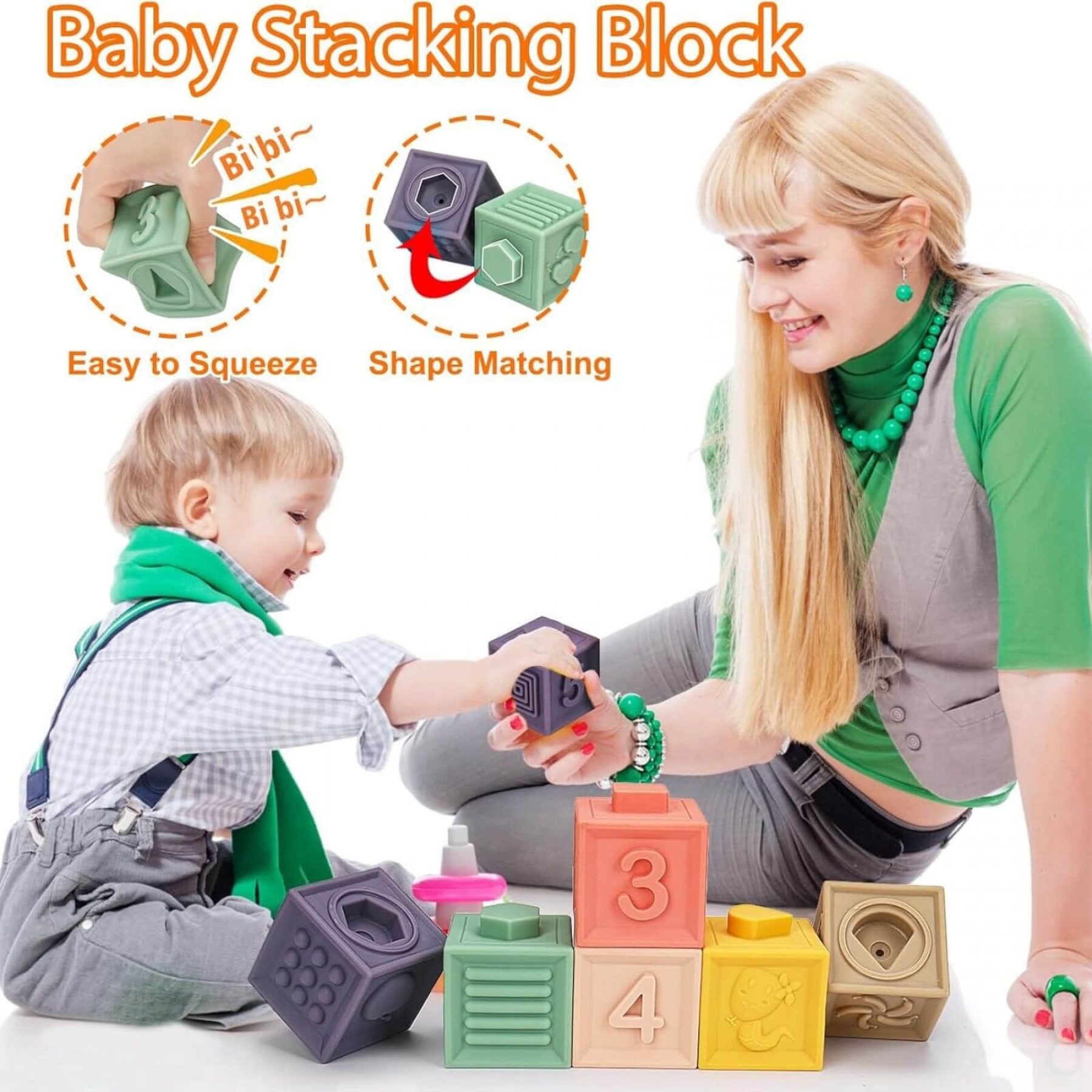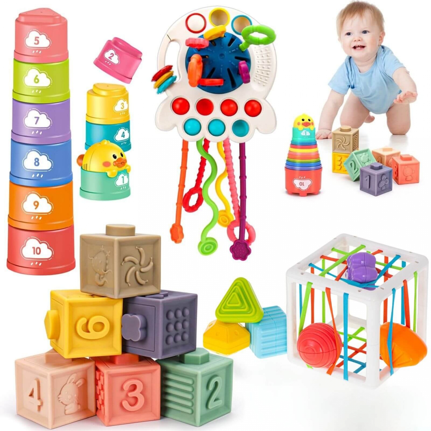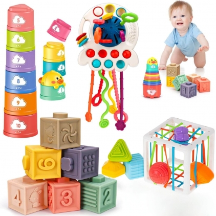 Ofera-i bebelusului tau un start excelent in explorarea lumii cu acest set Montessori 4 in 1 , creat special pentru dezvoltarea motricitatii fine, coordonarii mana-ochi si abilitatilor cognitive. Conceput pentru copiii cu varste intre 6 si 24 luni, setul include jucarii sigure si colorate care incurajeaza joaca activa si invatarea prin descoperire. Setul contine 4 jucarii esentiale pentru dezvoltarea armonioasa a celor mici: un cub senzorial cu benzi elastice si forme geometrice, 15 cuburi din silicon moale cu texturi si cifre, un turn din cani colorate pentru baie cu varf in forma de ratusca si o jucarie caracatita pentru dentitie si joaca interactiva. Acest pachet este ideal pentru parintii care cauta cadouri inteligente si utile pentru copii intre 6 si 24 luni. Fiecare element este realizat din materiale sigure si certificate, perfecte pentru explorare senzoriala, joaca la baie sau momente de liniste. Beneficii produs: Dezvolta motricitatea fina si coordonarea ochi-mana Incurajeaza invatarea timpurie a formelor, culorilor si texturilor Poate fi folosit ca jucarie de dentitie si pentru calmare Ideala pentru baie, calatorii, acasa sau in scaunul de masa Stimuleaza gandirea logica si rabdarea prin jocul de sortare Ajuta la recunoasterea numerelor si la primele notiuni de matematica Poate fi utilizata individual sau integrata in activitati mai complexe Un cadou educativ si versatil, potrivit atat pentru fete, cat si pentru baieti Specificatii tehnice: Varsta recomandata: 6 luni+ Materiale: silicon, plastic ABS, polipropilena (fara BPA) Numar total de piese: 38 Certificare: CE, sigur pentru dentitie Continut pachet: 1 x Cub senzorial Montessori cu benzi elastice si forme (7 piese, 12 luni+) 1 x Set 15 cuburi senzoriale din silicon moale cu texturi si cifre (6 luni+) 1 x Turn din 10 cani de stivuire + varf ratusca (11 piese, 18 luni+) 1 x Jucarie caracatita cu snur din silicon pentru motricitate si dentitie (6 luni+) Recomandari de utilizare: Ofera copilului o jucarie pe rand pentru a observa interesul si a stimula curiozitatea Utilizeaza cuburile si formele pentru a invata culorile, cifrele si potrivirea Foloseste canile in baie pentru distractie cu apa si dezvoltarea simtului tactil Ofera jucaria caracatita pentru dentitie in perioadele de eruptie dentara