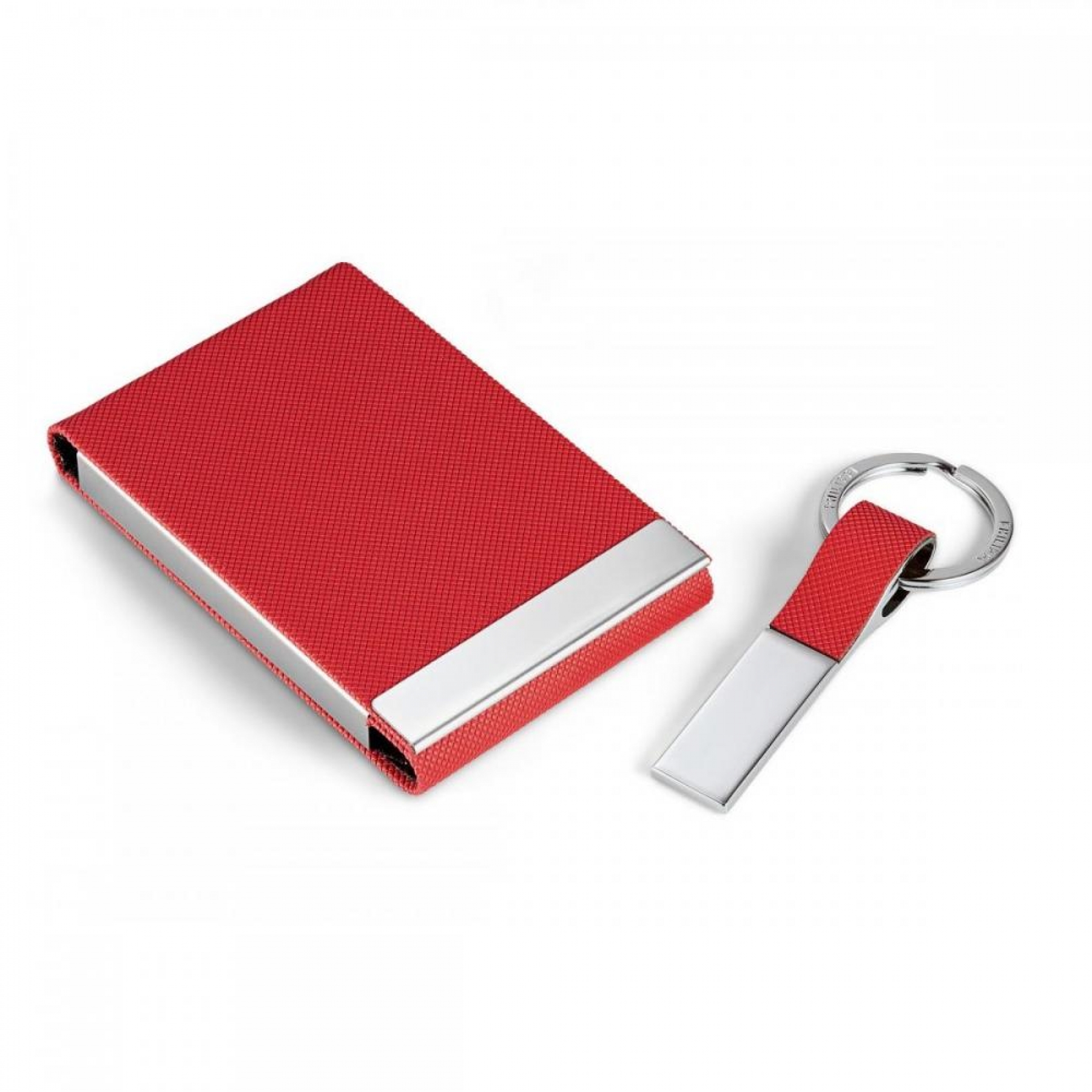 Setul este format dintr-un suport simplu de carti de vizita rosu si un breloc pentru chei asortat.