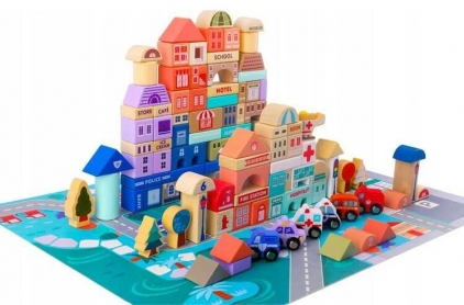 Set 115 cuburi de constructie din lemn, Oras, pista si masini. Cuburi constructie din lemn, colorate si distractive - 115 piese. Cu ajutorul acestor cuburi, copilul invata formele geometrice, culorile, modul in care se potrivesc formele, cum sa construiasca, stimulandu-i creativitatea si vederea in spatiu. Caracteristici : - 115 piese din lemn (dimensiunile sunt afisate in imagini); - forme diferite (patrat, cilindru) cu ajutorul carora se pot construi diferite cladiri ( spital, statie sectie politie, pompieri, cafenea, hotel si multe altele ). - culori diferite, cifre, masini din lemn (ambulanta, politie, masina de pompieri, autobuz scolar, taxi); - plansa puzzle din carton cu desene sosele, parcare; - saculet pentru depozitare piese; - manual cu modele de construit. Este un joc care dezvolta creativitatea, indemanarea si imaginatia, poate fi utilizat atat acasa impreuna cu alte jucarii existente in camera copilului cat si in gradinite. Material : Lemn si carton (plansa). Varsta recomandata : 3 ani+.