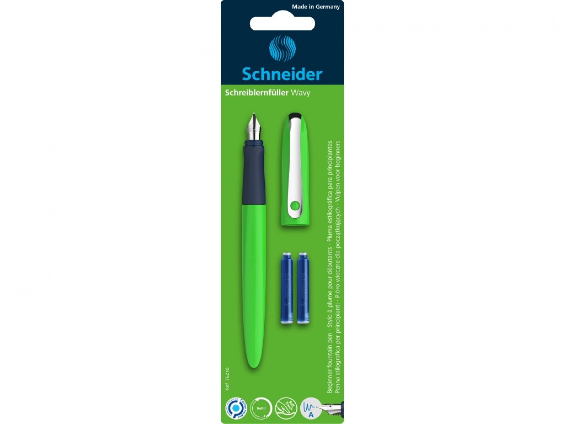 Stiloul Wavy, creat pentru elevi, este disponibil în patru culori strălucitoare — albastru, verde, roz și portocaliu -- și este echipat cu peniță din oțel inoxidabil, rezistentă, și cu vârf din iridiu - perfect pentru elevii care încep să scrie cu stiloul. Zona de prindere, cauciucată, ergonomică, potrivită pentru dreptaci și stângaci, induce poziția corectă de scris; în plus, zona generoasă pentru prindere, moale, disipă punctele de presiune.Wavy funcționează cu cartușe de cerneală și convertoare standard, ceea ce îl face ideal pentru utilizarea de zi cu zi, la școală. Produsul este fabricat cu responsabilitate față de mediu, neutru din punct de vedere ecologic.