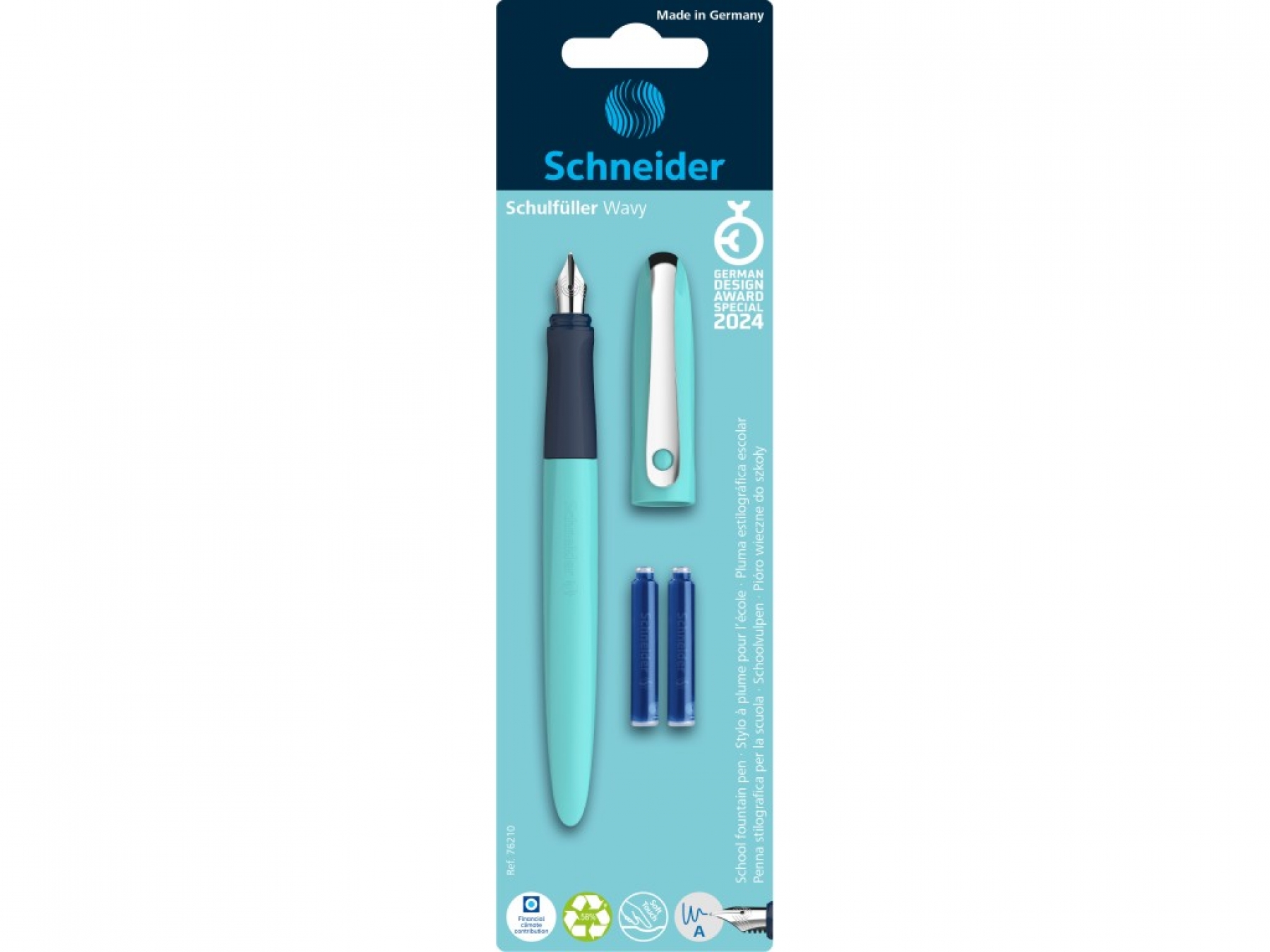 Stiloul Wavy, creat pentru elevi, este disponibil în patru culori strălucitoare — albastru, verde, roz și portocaliu -- și este echipat cu peniță din oțel inoxidabil, rezistentă, și cu vârf din iridiu - perfect pentru elevii care încep să scrie cu stiloul. Zona de prindere, cauciucată, ergonomică, potrivită pentru dreptaci și stângaci, induce poziția corectă de scris; în plus, zona generoasă pentru prindere, moale, disipă punctele de presiune.Wavy funcționează cu cartușe de cerneală și convertoare standard, ceea ce îl face ideal pentru utilizarea de zi cu zi, la școală. Produsul este fabricat cu responsabilitate față de mediu, neutru din punct de vedere ecologic.