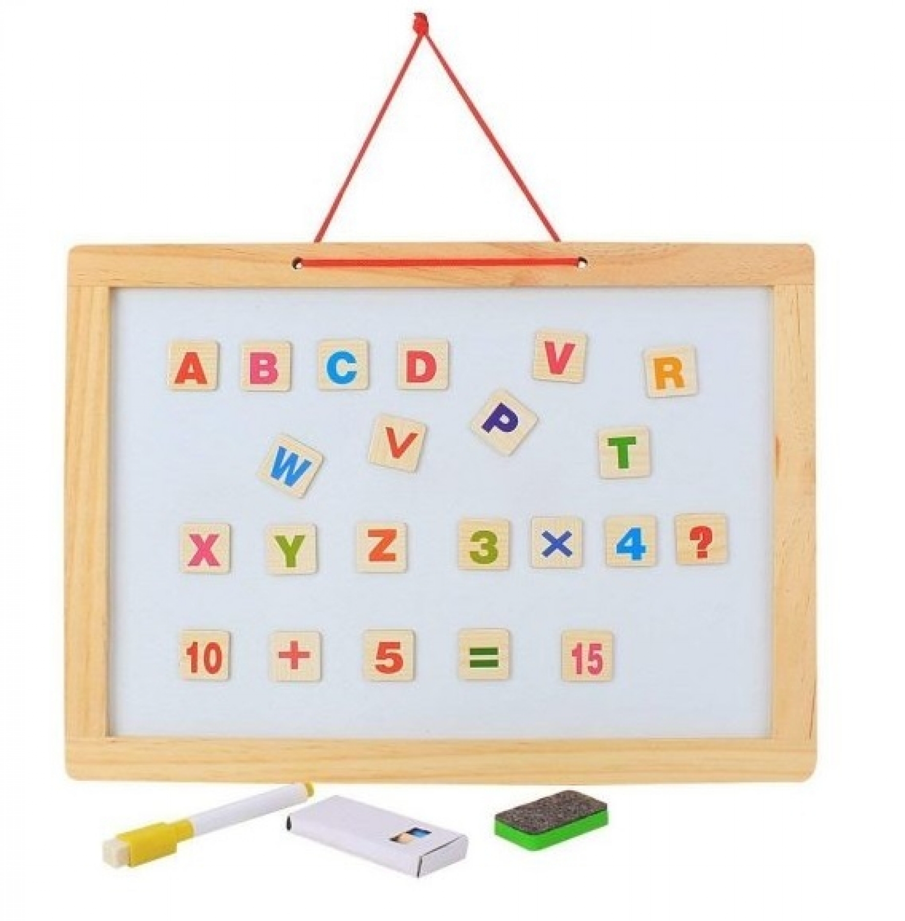 Tablita magnetica pentru scris si desenat cu cifre, litere si tangram. Tabla magnetica pentru scris si desenat permite copilul dumneavoastra sa-si dezvolte imaginatia prin desen, sa scrie cuvinte sau sa faca primele calcule. Copiii asimileaza informatii mult mai usor daca acestea sunt prezentate intr-un mod cat mai placut si relaxant pentru ei. Asadar, transformati camera acestuia intr-un loc de joaca dar si intr-o amuzanta sala de clasa, cu ajutorul acestei table educative din lemn. Tablita magnetica pentru scris si desenat cu cifre, litere si tangram este compusa din: - o tablita magnetica pe care se poate scrie si desena cu carioca (whiteboard); - o tablita magnetica (aceeasi tabla pe care se poate desena cu carioca) pentru formarea de peisaje cu piesele colorate magentice care se pot pune pe suprafata magentica; - o tablita neagra pe care se poate scrie cu creta - tabla magnetica are pe verso tabla neagra; - un pachet cu litere si cifre prevazute cu magnet (magnetice); - un joc tangram cu 7 piese prevazute cu magnet (magnetice) care se foloseste pe tabla magnetica. Tabla magnetica din lemn educativa este multifunctionala, copiii avand posibilitatea sa invete sa se joace in mai multe moduri. , , , , , , Material: Lemn, piesele sunt vopsite cu vopsele nontoxice, in culori vii. Dimensiuni tabla cu rama din lemn : 44cm x 33cm x 1.5cm Dimensiuni tabla suprafata de scris : 41.5 cm x 30.5 cm Varsta recomandata: 3 ani + Avertismente! Jucaria produsul poate contine piese mici care se pot inghiti sau inhala existand pericolul de sufocare sau nu este potrivita copiilor mai mici de 3 ani. Nu lasati ambalajele jucariilor produselor la indemana copiilor. Indepartati orice ambalaj al jucariei produsului inainte de a da jucaria produsul copilului. Va rugam sa supravegheati copilul in timp ce se joaca foloseste acest produs. Pastrati instructiunile si etichetele pentru referinte viitoare. Pastrati jucaria produsul departe de foc, feriti jucaria produsul de temperaturi ridicate si umiditate. Produsul este nou si comercializat in ambalajul original al producatorului. Imaginile au caracter informativ. Nuanta, tonul si intensitatea culorii pot varia in functie de monitor.