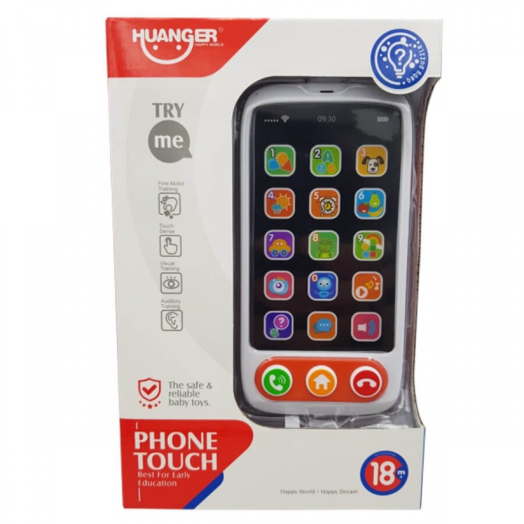 Telefon interactiv - Primul meu Smartphone, telefonul bebelusului cu touchscreen si butoane. Aceasta jucarie interactiva imita un dispozitiv real si are caracteristici si functii speciale care mentin atentia copilului, stimuleaza si antreneaza simtul vizual si pe cel auditiv. Jucarie telefon interactiv pentru bebe cu butoane si touchscreen are 5 functii incluse: Functia de numere , cand sunt apasate pe ecran patratele de la 0 la 9, o voce insotita de lumini reda prin voce cifra apasata; Functia de recunoastere , cand sunt apasate pe ecran patratele de la 0 la 9, o voce insotita de lumini reda continutul din patratelul selectat; Functia muzicala - cand sunt apasate pe ecran patratele de la 1 la 8 vor fi redate sunete si melodii; Functia de pictura , cand se apasa oricare patratel si butonul de lumina, copilul poate desena; Functia joc Whack-a-Mole , aceasta functie ofera 5 nivele provocatoare a clasicului joc. Functioneaza pe baterii si este un telefon jucarie ce incurajeaza jocul de rol: copilul imita comportamentul unui adult care utilizeaza un dispozitiv de acelasi tip si astfel descopera lucruri noi in fiecare zi. De asemenea, cu ajutorul acestui telefon de jucarie, copilul poate sa recunoasca forme, animale, obiecte, fructe, legume, culori dar si sunete. Dimensiuni : 16 cm x 2 cm grosime x 8 cm Varsta recomandata : 18+ luni