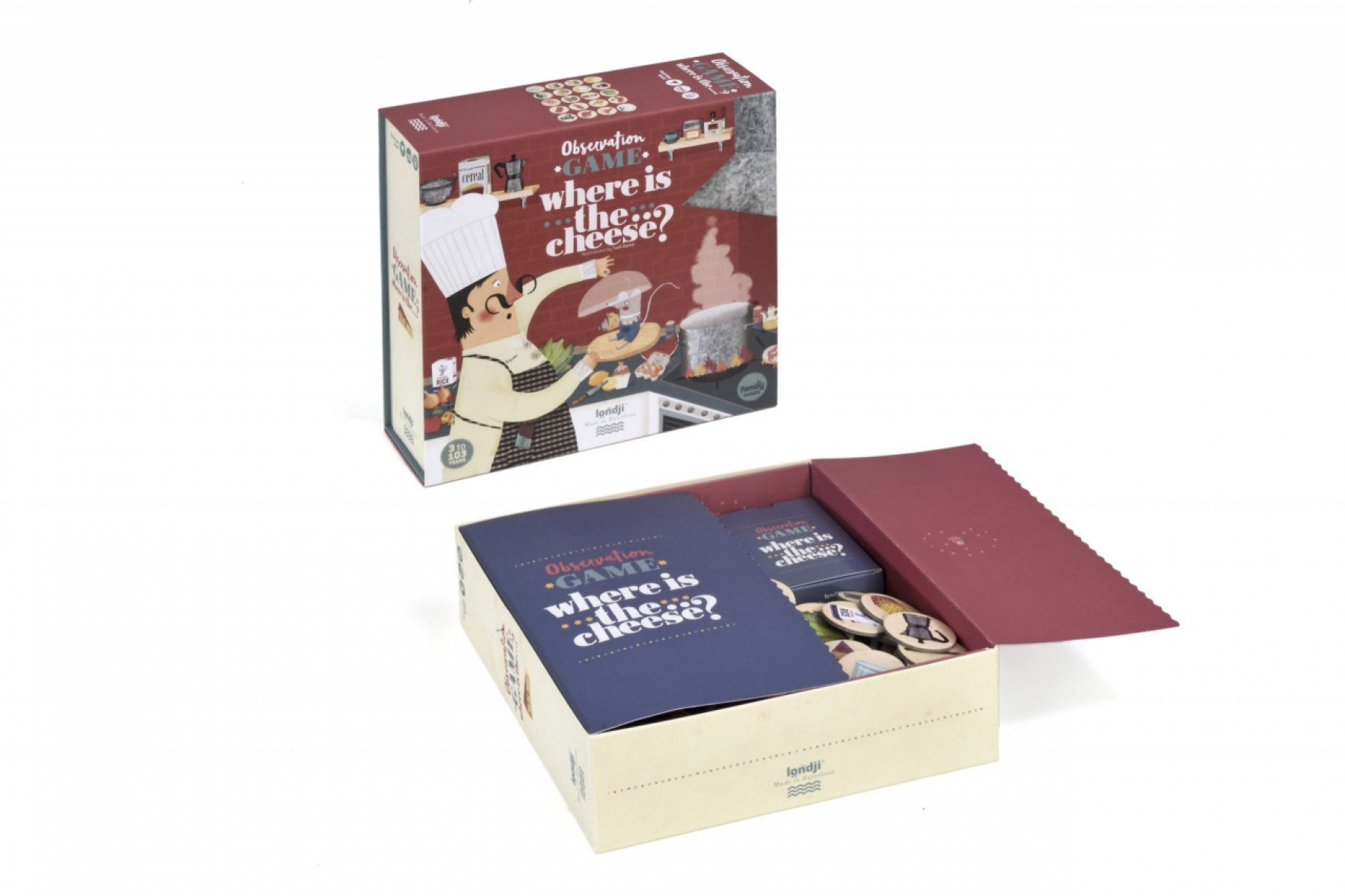 Unde e cascavalul, joc de observatie Joc de observatie pentru intreaga familie. Ajuta bucatarul sa gaseasca rapid cele 10 ingrediente necesare pentru pregatirea cinei! Un joc de observatie pentru intreaga familie! Ilustratie Txell Darne Ambalat in cutie robusta din carton. Contine 6 table de joc, fiecare de completat cu cate 10 ingrediente, 80 de token-uri cu ingrediente. Varsta recomandata: 3 - 103 ani. Confectionat din hartie FSC si carton reciclat conform reglementarilor EN71ASTM. AVERTISMENT: Contraindicat copiilor sub 3 ani. Se recomanda supravegherea copilului de catre un adult in timpul jocului. Producator: Londji, Spania.