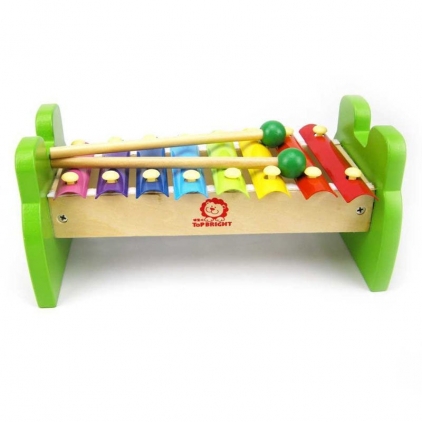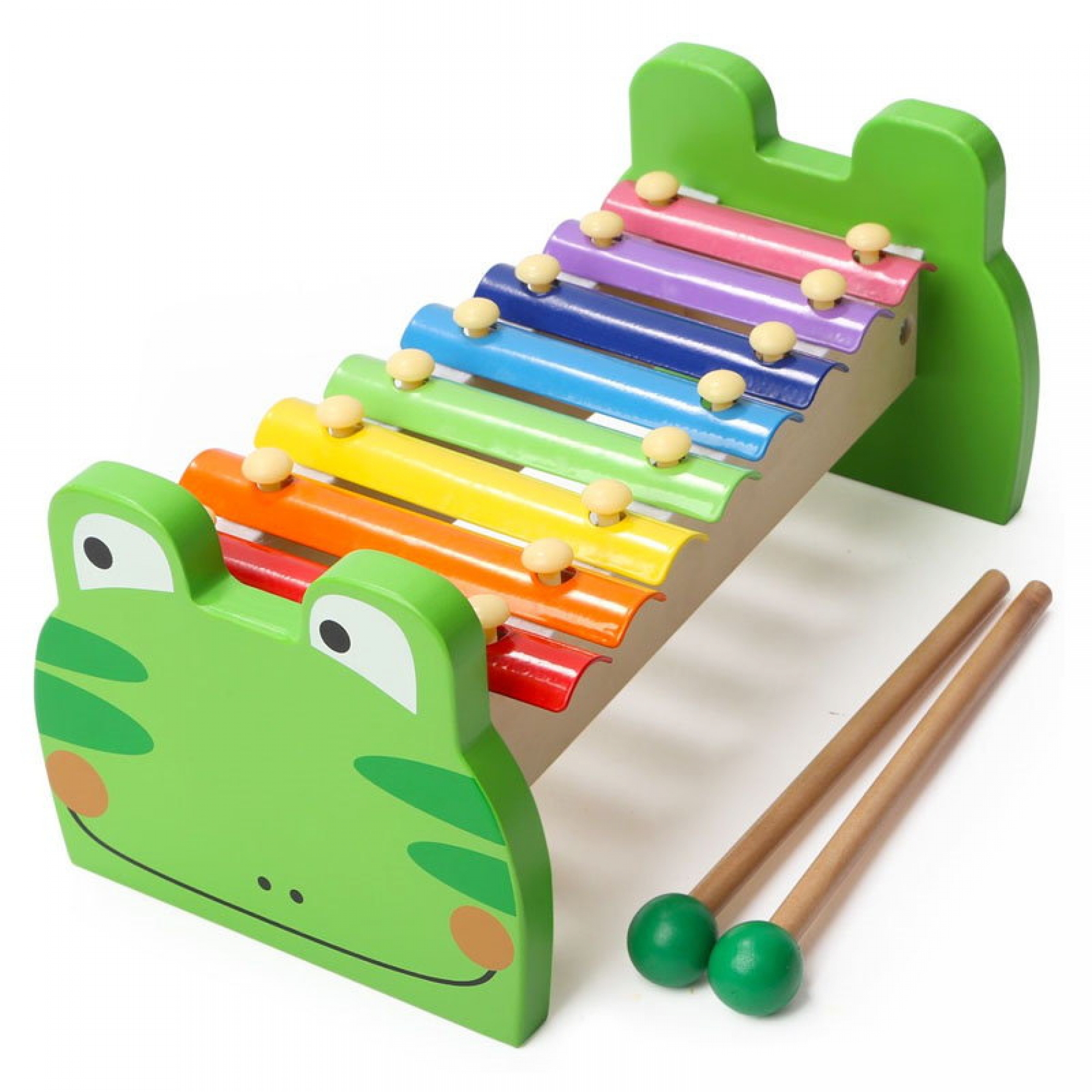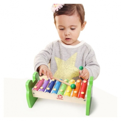 Copiii vor fi incantati de acest xilofon adorabil din lemn, cu o figura simpatica de broscuta verde si 8 clape viu colorate din metal. Micutii muzicieni in devenire vor fi ocupati ore intregi cu acest instrument de jucarie, distrandu-se si bucurandu-se de magia sunetelor cristaline si clare. Xilofonul are un design frumos, compact, culori vibrante si luminoase si este format dintr-o punte din lemn de inalta calitate, avand la capete doua figuri simpatice de broscute verzi, pe care sunt asezate clapele din metal, viu colorate. Vopselele luminoase si vibrante si lacurile folosite sunt non-toxice. Include doua ciocanele din lemn cu ajutorul carora copiii pot atinge placutele metalice pentru a scoate suntele cristaline si melodioase. Jucaria ii va familiariza pe micuti cu muzica si ritmul, le va dezvolta creativitatea, simtul auditiv, urechea muzicala, coordonarea miscarilor, atentia distributiva, motricitatea fina, gandirea si ii va ajuta sa recunoasca formele si culorile. Dimensiuni: 24 x 13 x 11 cm Varsta potrivita: 18 + luni