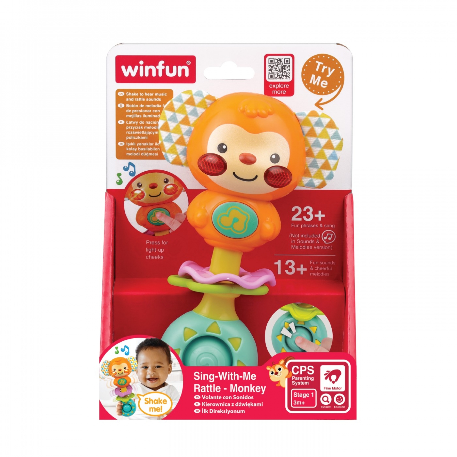 Zornaitoare Maimutica Distractie Senzoriala pentru Bebelusi de la 0 Luni + Zornaitoarea maimutica este jucaria perfecta pentru bebelusi incepand de la varsta de 0 luni, fiind conceputa pentru a stimula dezvoltarea senzoriala si abilitatile motorii fine. Usor de prins, cu un design ergonomic, aceasta jucarie are urechi incretite care ofera o textura interesanta pentru explorare tactila. Apasand butonul melodie, obrajii maimutei se lumineaza intr-o combinatie fascinanta de culori, captand atentia bebelusului si stimulandu-i simturile vizuale. Pe langa lumini, jucaria emite sunete si fraze distractive, precum si cantece si melodii care va vor amuza si incanta micutul. Aceste sunete sunt perfecte pentru a dezvolta perceptia auditiva si pentru a introduce bebelusul in lumea muzicii si a sunetelor. Zornaitoarea este echipata cu inele care, atunci cand sunt scuturate, produc sunete ce incurajeaza interactiunea activa, ajutand la dezvoltarea coordonarii mana-ochi si a intelegerii relatiilor cauza-efect. Compacta si usor de transportat, zornaitoarea maimutica este ideala pentru a fi luata oriunde, asigurand ca bebelusul tau va avea mereu la indemana un companion de joaca.